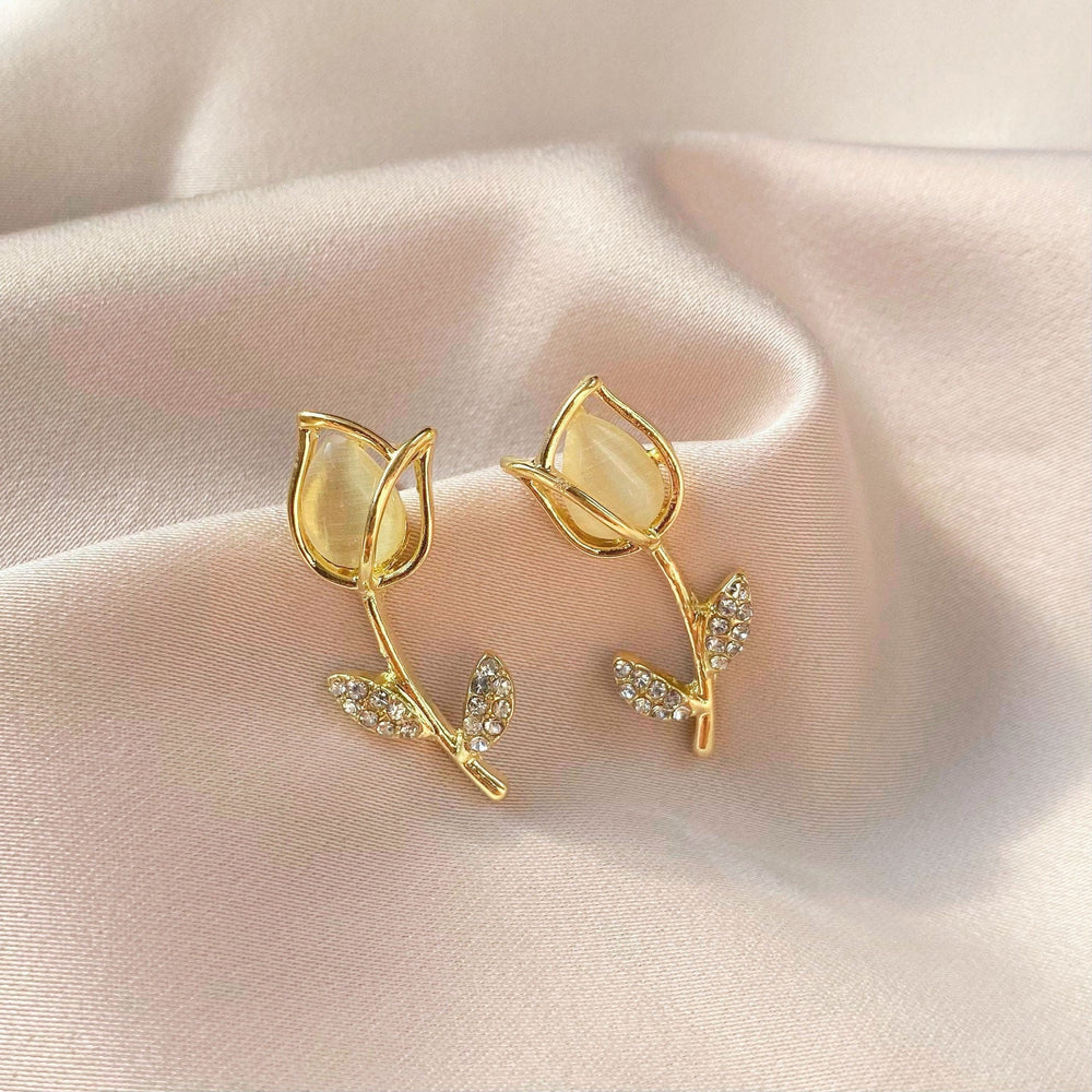 Delightfully dainty and elegantly gold plated, these Cat¡¯s Eye Stone Tulip Earrings are the perfect addition to any outfit. Made with solid sterling silver posts and adorned with charming flowers, these earrings are perfect for the quirky and playful mom in your life (or any mom, really).14k gold plated vermeil.