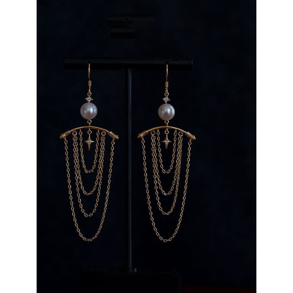 Elevate your style with our stunning Exotic Dangle Earrings. Crafted with real gold plating and an anti-tarnish finish, these earrings combine elegance and durability, making them a perfect addition to any jewelry collection. The intricate design features multiple gold chains gracefully hanging from a single pearl, creating a sophisticated and eye-catching look.