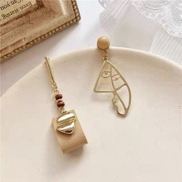 Crafted with hypoallergenic alloy for sensitive ears, these quirky face earrings feature mismatched abstract and cubism portraits. The asymmetric dangle design adds a playful touch, and the faux leather beige rectangles offer a unique twist. 14k gold plating and solid sterling silver posts complete the eclectic look. Length options: 55mm or 60mm.?