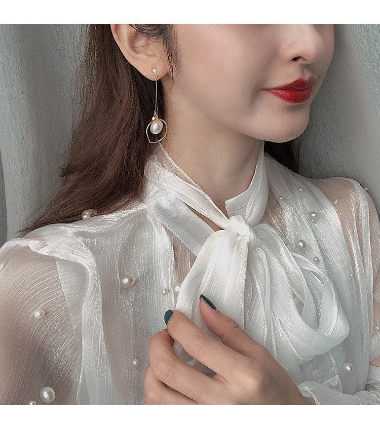 Asymmetrical pearl earrings with a modern twist. Perfect for any occasion, these versatile gold and silver earrings add a touch of elegance and fashion-forward style to any outfit. Upgrade your accessory game with these statement pieces featuring an asymmetric design and pearl accents. (Warning: may cause envious glances and compliments.)