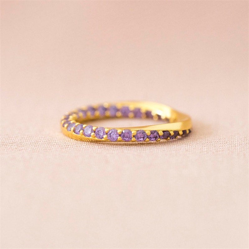 Shower safe materials make this stunning M?bius ring perfect for elegant events and fancy get-togethers. Featuring 14K yellow gold plating and sparkling purple CZ crystals, it's an all-around luxurious and eye-catching addition to your accessory collection. Anti-tarnish properties ensure long-lasting shine.?
