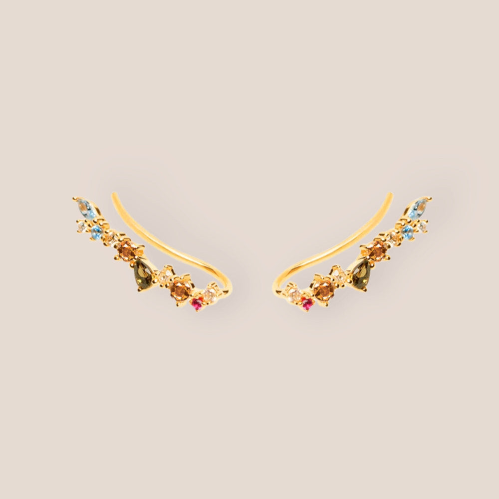 Unleash the radiance of a sunset on your ears with our Sunset Cascade Pave Stone Ear Climbers. Designed to capture the vibrant hues of a dusk sky, these ear climbers are a symphony of color, set against the rich warmth of gold to create a breathtaking statement.